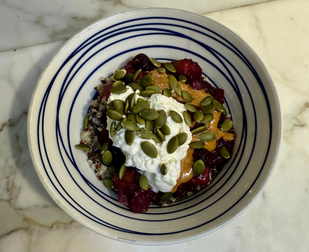 Then came breakfast: a colourful quinoa bowl that I like to call “Fridge Fruit Fiesta”. Each week I make a big batch of stewed leftover fruit—this week’s blend featured apples, pears, orange, and frozen blueberries with a good sprinkle of cinnamon and some mint leaves that were on the brink of a wilted death. I tossed that fruity compote over some fluffy quinoa that I made over the weekend and heated it all for about 2 minutes in the microwave. I then added a dollop of almond butter, a scoop of lactose-free cottage cheese (I have always loved cottage cheese and I am thrilled that what was once an almost embarrassing food choice has become popular thanks to the protein junkies), and sprinkled ground flaxseed and pumpkin seeds over the top like a crunchy little crown. It was warm, cozy, and tasted like someone who’s got their life together. (Spoiler: I don’t, but breakfast says otherwise.)