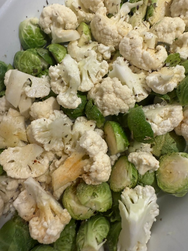 The kids had broccolini on the side, while my husband and I made do with roast Brussels sprouts and cauliflower—the last remaining souls from last week’s veg box. I roasted them in olive oil, garlic, oregano and thyme until they were crispy little miracles.