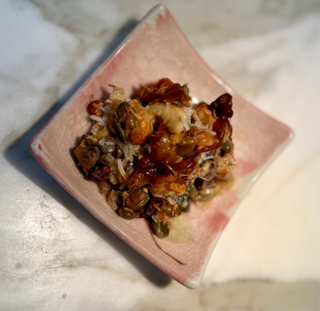 I fell victim to an Instagram trend (again) and made those 4-ingredient cashew-coconut-choc-chip cookies. I discovered these on Alexandra Lourdes’ YouTube channel here but have adapted them to include pumpkin seeds (a repeat for me after breakfast but it’s a good way to get a seed into the small humans in my family), so maybe they were more of a 5-ingredient rebellion cookie? Regardless, they were decadent, sticky, chewy, and looked like something a toddler would make at playgroup—but tasted divine.